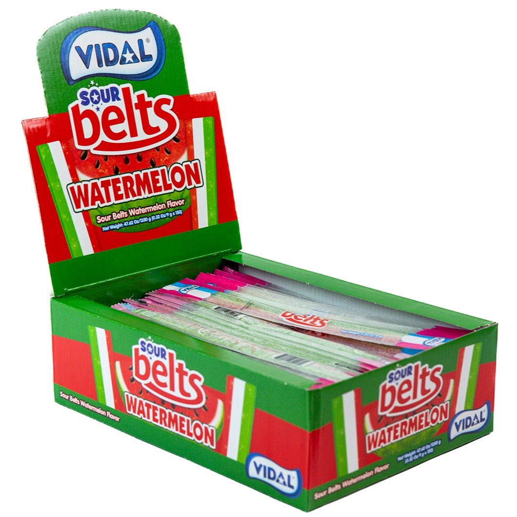 Watermelon flavored gummy belts with a sour sugar coating. Wrapped in a tub of 150 pieces!